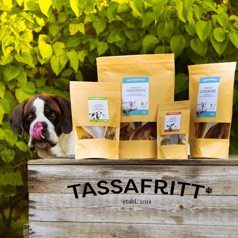 Gör din pälskling vild av lycka med ett smaskigt och näringsrikt hundtugg. Och som du kan ge med gott samvete! Innehåller endast en ingrediens. Majoriteten av vårt hundgodis tillverkas av svensk nöt, gris, lamm, kyckling eller vilt. Vi har även ett noggrant urval viltprodukter med råvaror från Europa. Allt svenskt godis har en Sverige flagga på påsen samt skriftlig information på fram och baksida. Produkter med råvaror från Europa är märkta med EU flagga samt skriftlig information.