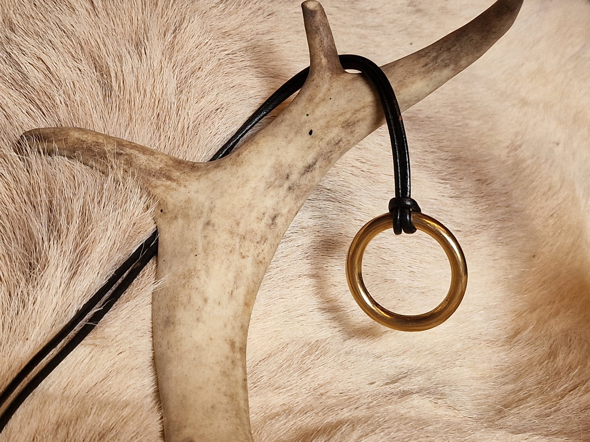 Halsband i svart skinn med spänne i sterlingsilver. Mässingsring (medium) som berlock.