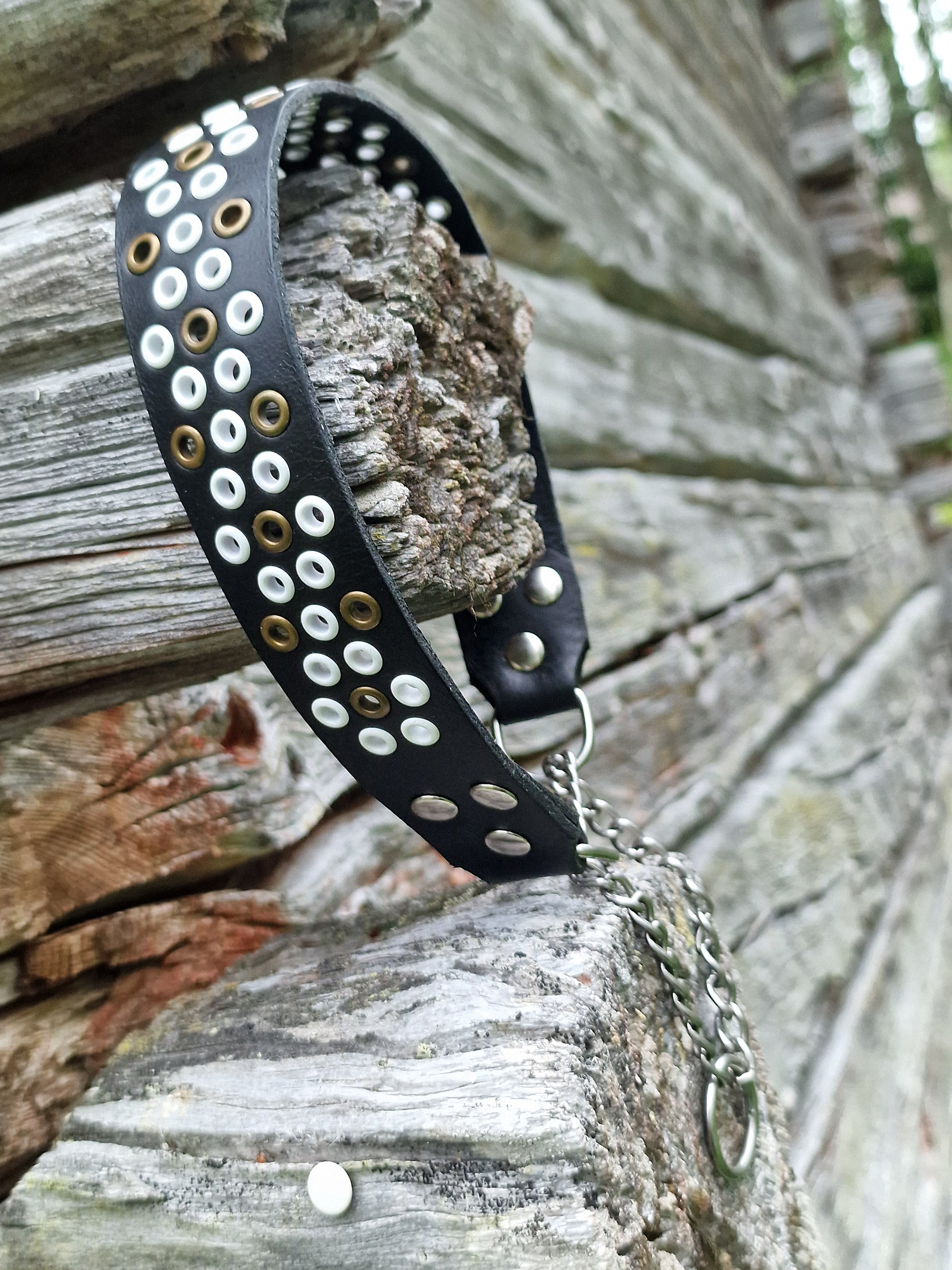 Halvstryp i svart läder, 3 cm brett. Dekorerad med brons- och vita öljetter.
