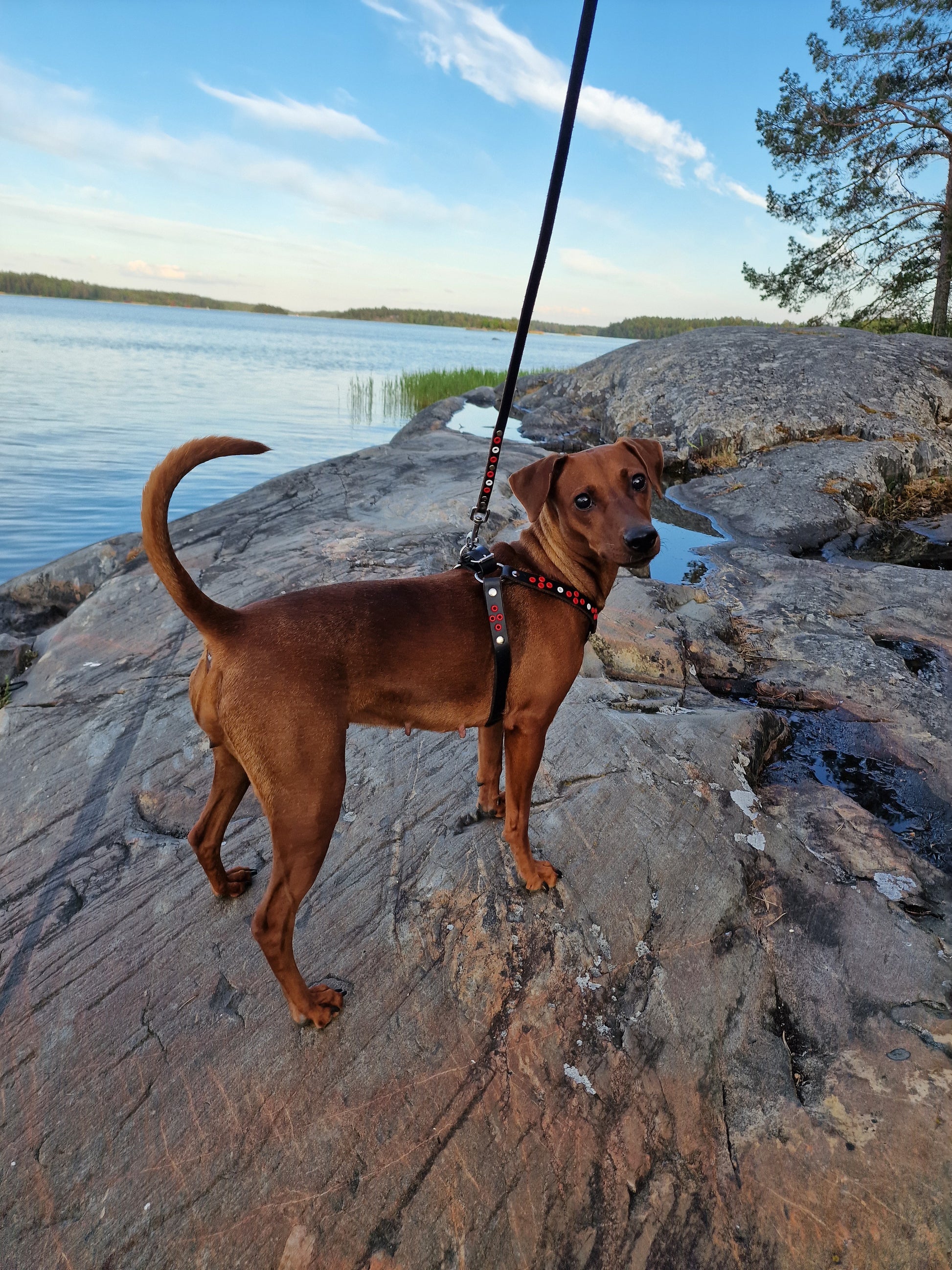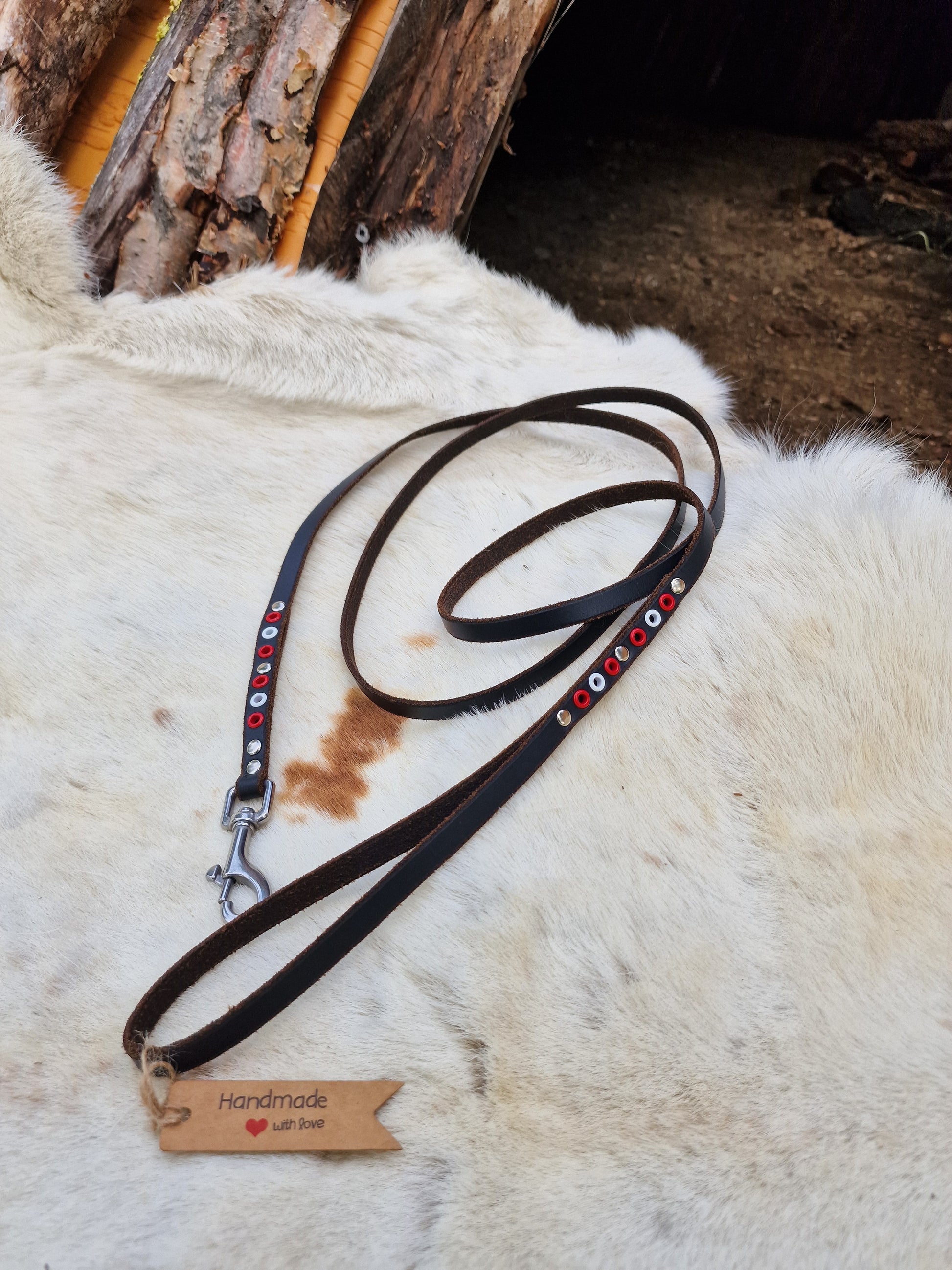 Hundkoppel i svart läder, 1 cm brett med pistolhake. Dekorerad med röda och vita öljetter.