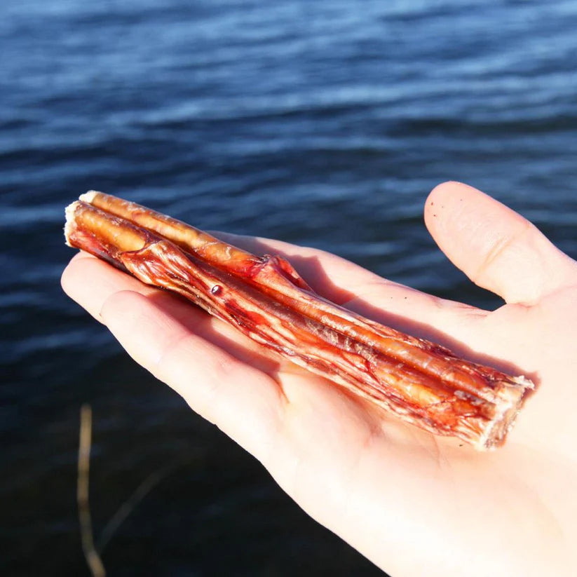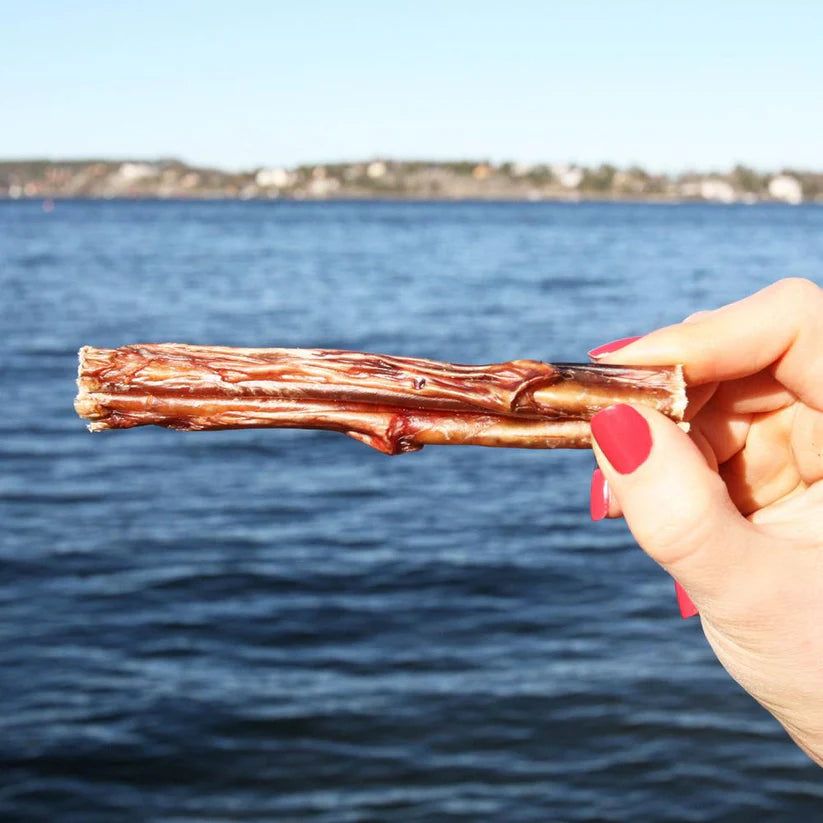 Till skillnad från Svensk Torkad Tjurmuskel 20 cm passar denna variant bättre till valp och mindre hundar. Den är cirka 10 cm lång och går inte att dela utan en vass kniv. Eftersom tjurmuskel är en naturlig råvara kommer den i olika tjocklekar, en del är tjocka och andra tunna. Vi har också tjurmuskel i ännu mindre delar.