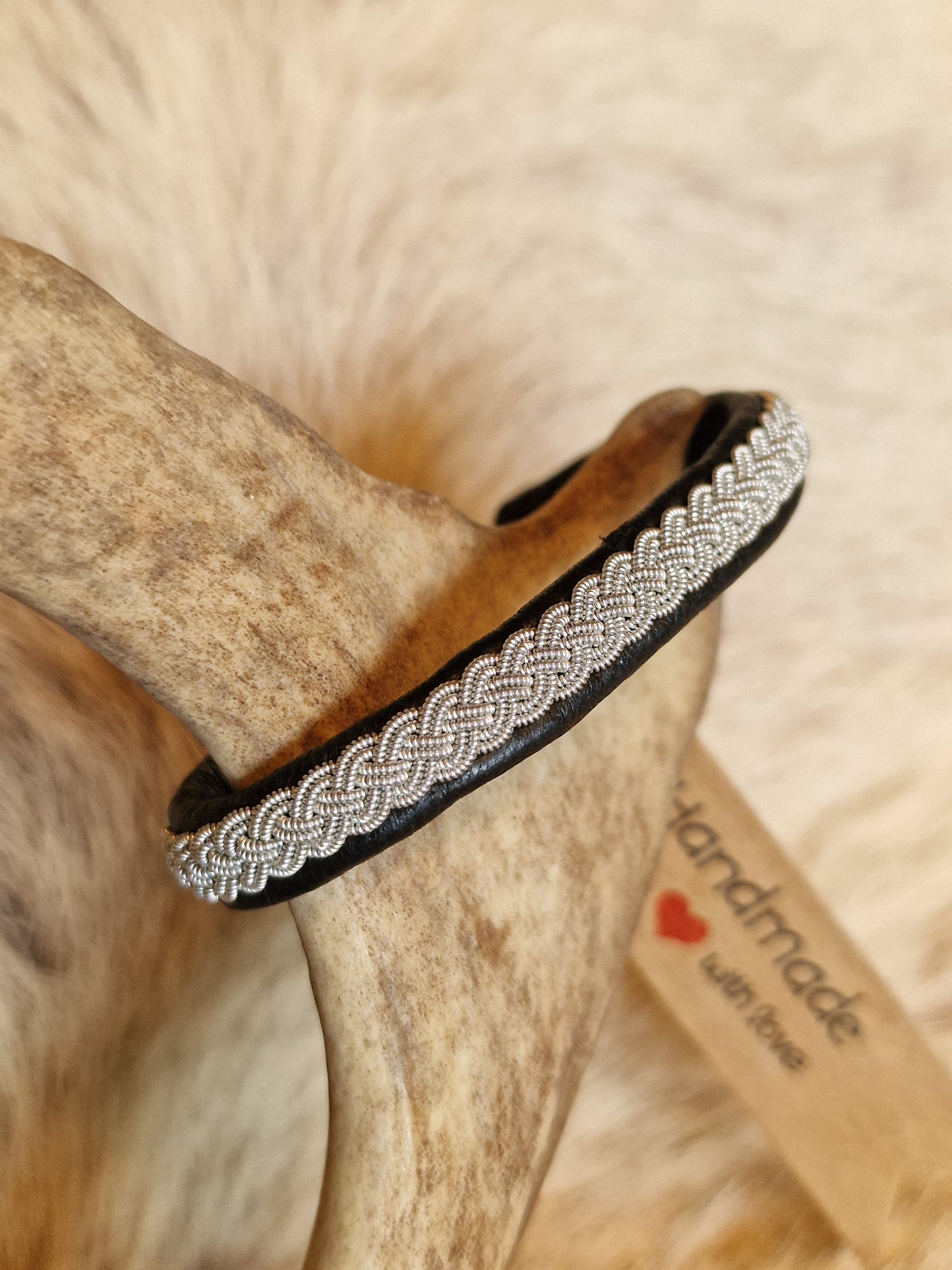 Svart naturgarvat renskinn, renhornsknapp och förstärkt ögla.