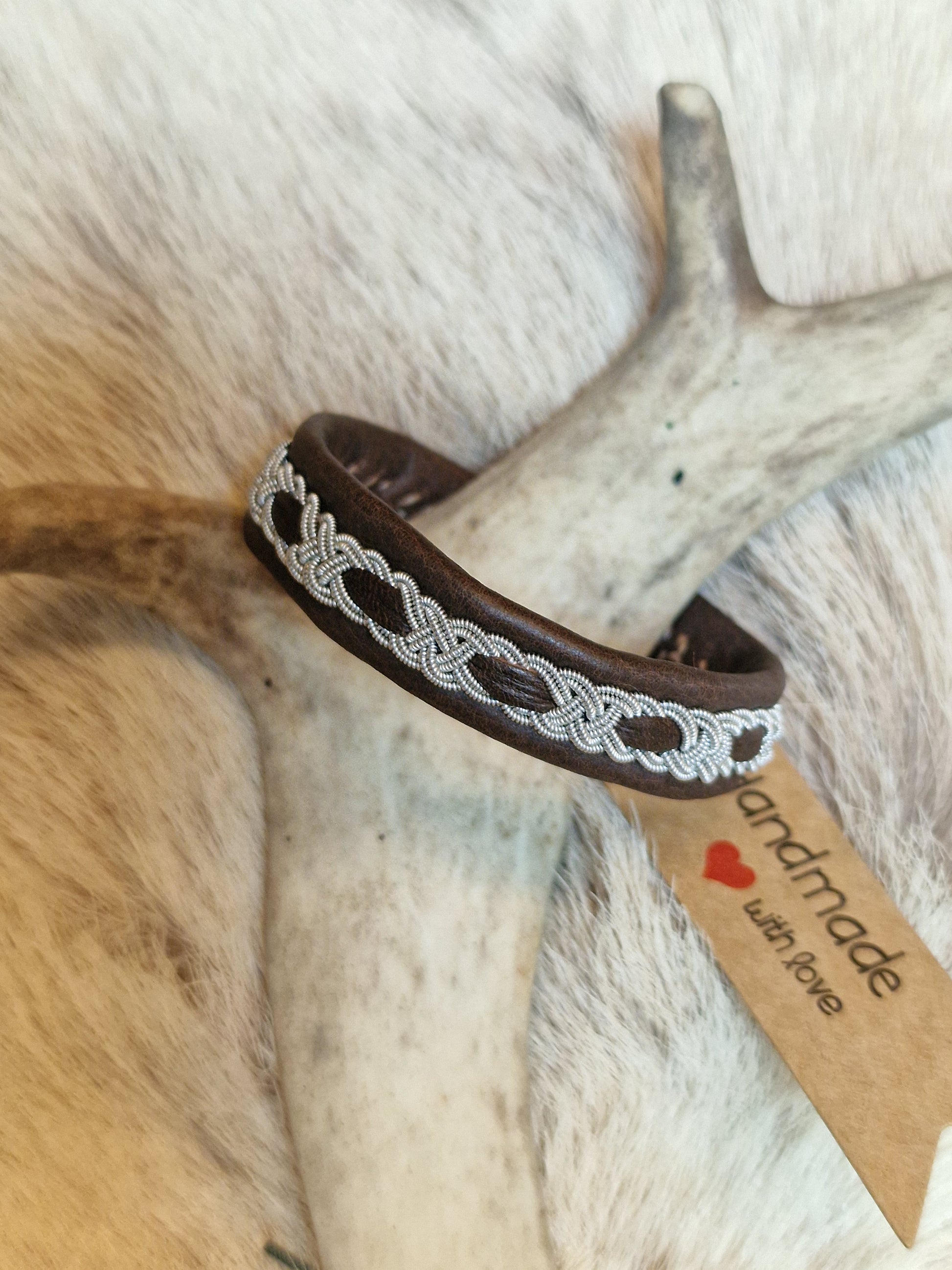 Brunt naturgarvat renskinn, renhornsknapp och förstärkt ögla.
