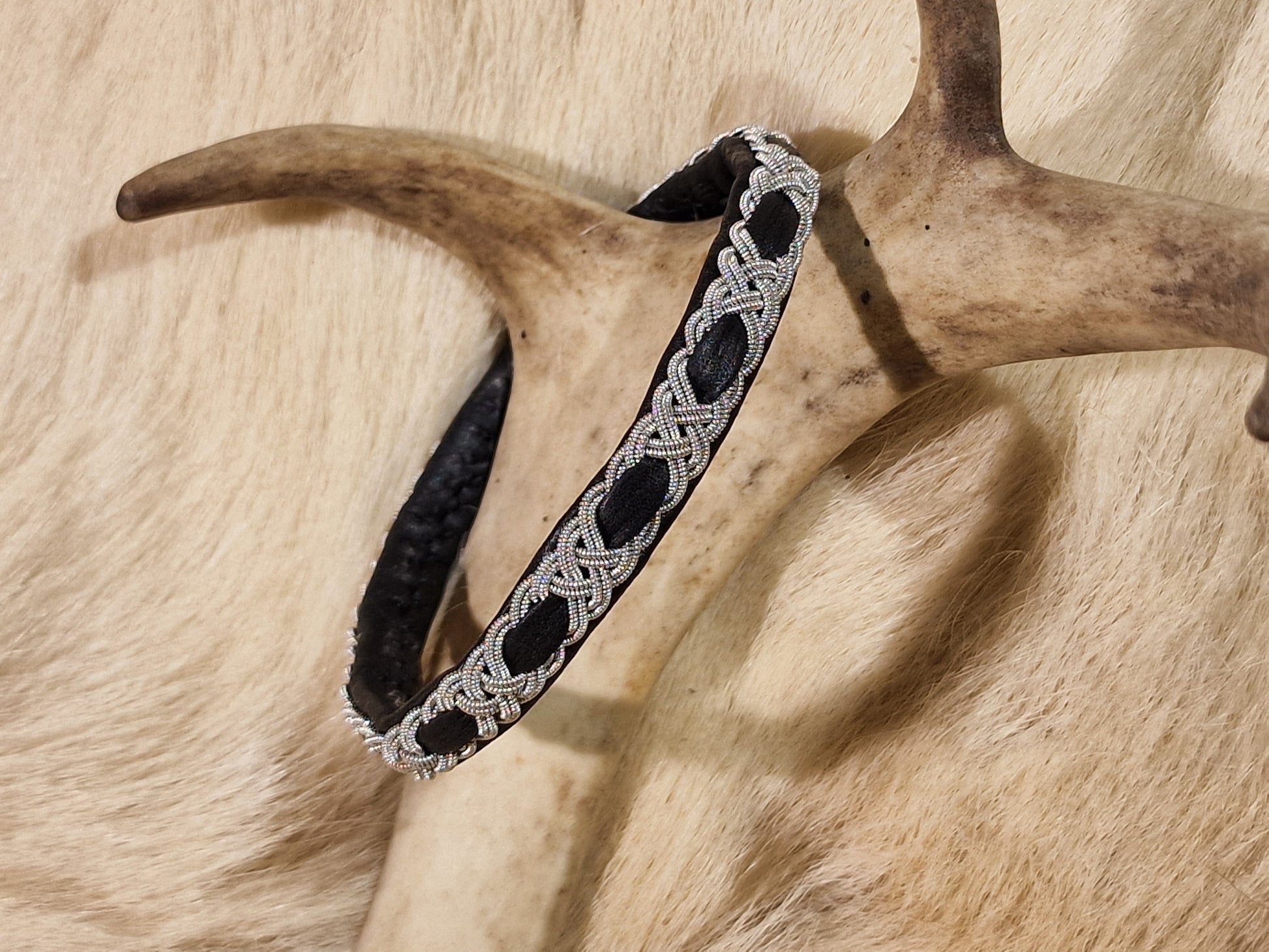 Svart naturgarvat renskinn, renhornsknapp och förstärkt ögla.