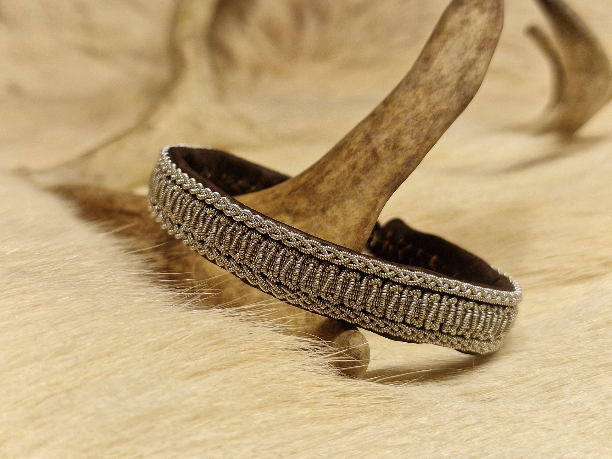 Brunt naturgarvat renskinn, renhornsknapp och förstärkt ögla.